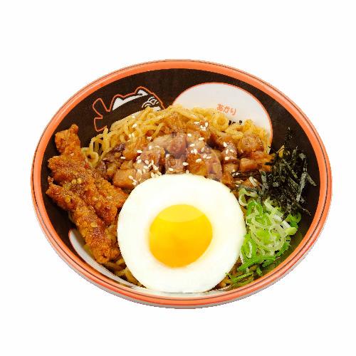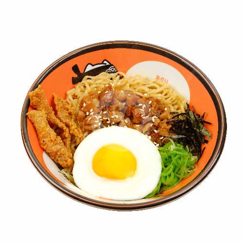 Spicy-sweet soy sauce seasoned Ramen with fried egg, spicy chicken skin, chicken teriyaki sauce, nori, leek sesame seed