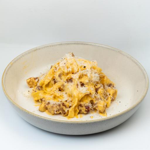Guanciale ( PORK ), Parmesan, Fettuccine ( 1cm thick flat pasta spaghetti )