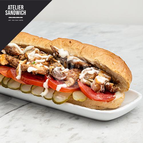Tender marinated chicken, garlic toum home made sauce, fresh pickles, wrapped in our unique crispy french baguette