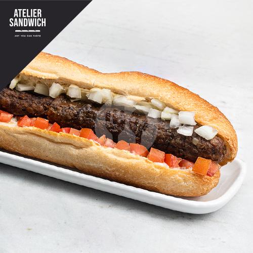 Charcoal-grilled spiced beef kefta, smoky and juicy, paired with fresh onions, tomato dices, and a little mayonnaise sauce, in our signature french baguette