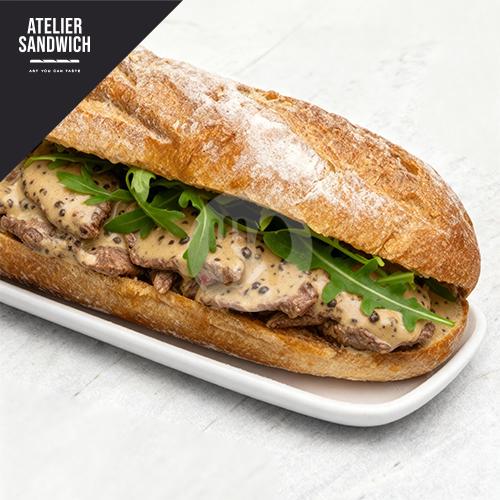 Tender slices of seared beef coated in a creamy French peppercorn sauce, layered with fresh roquette in our signature crispy baguette.