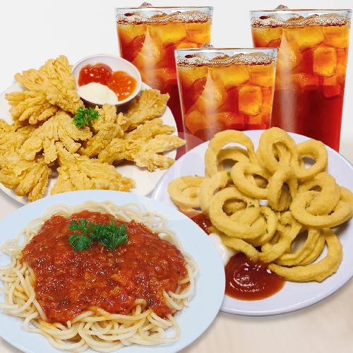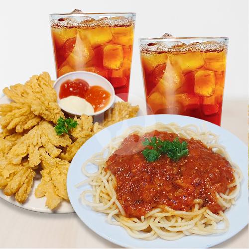 2 gelas ice tea, 1 porsi jamur, 1 porsi Spaghetti