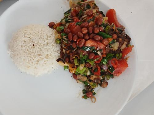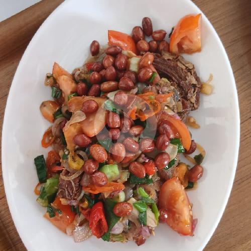 Bebek Goreng Dengan Taburan Bumbu Tumis (Bawang Merah, Bawang Putih, Bawang Pre, Tomat, Cabe, Kacang, Dan Seasoning)