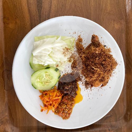 Bebek Goreng Dengan 3 Jenis Sambal (Bawang, Bumbu Hitam, Dan Mangga) Ditaburi Dengan Serundeng Lengkuas Yang Gurih