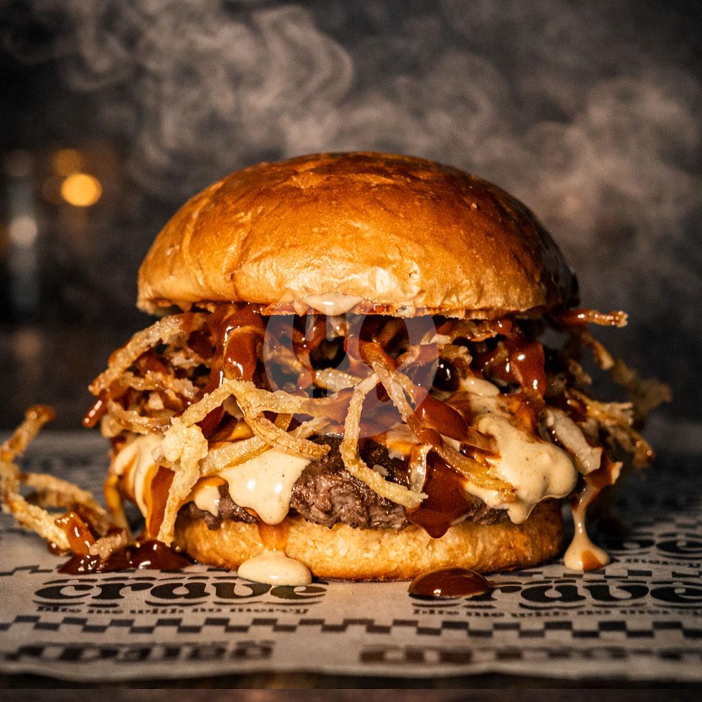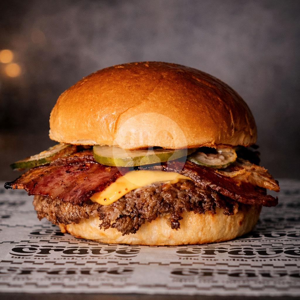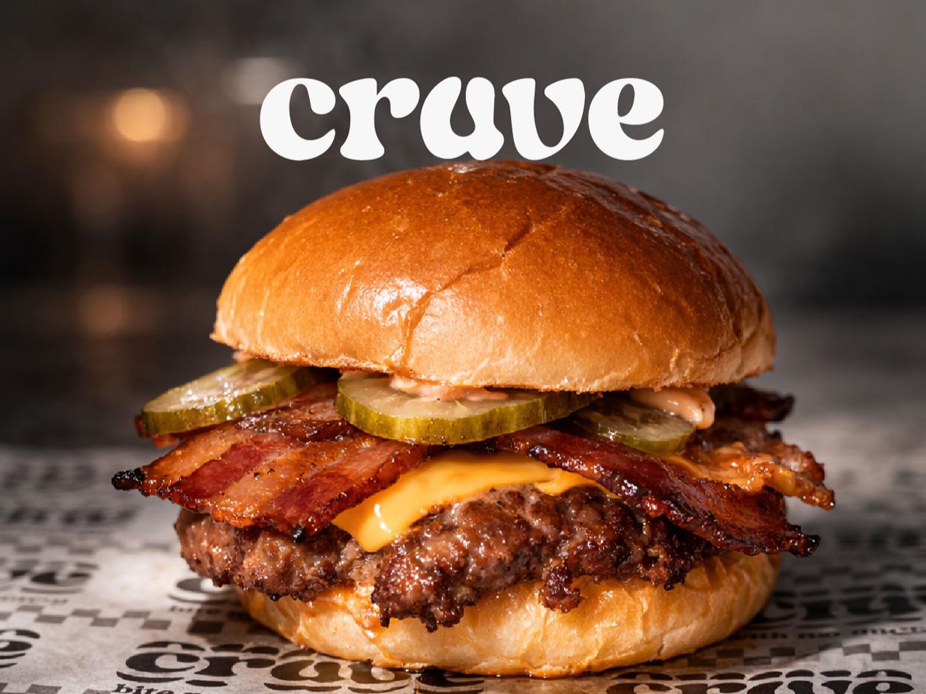 Butter burger bun with a 100g homemade smashed patty, two slices of cheddar cheese, crunchy bacon, caramelized onions, Crave mayo, and homemade pickled gherkins.