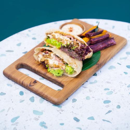 Pita pocket, rose harissa hummus, grilled oyster mushroom shawarma, tabbouleh, pickled onion, seed dukkah, sweet potato fries, vegan mayo tzatziki.