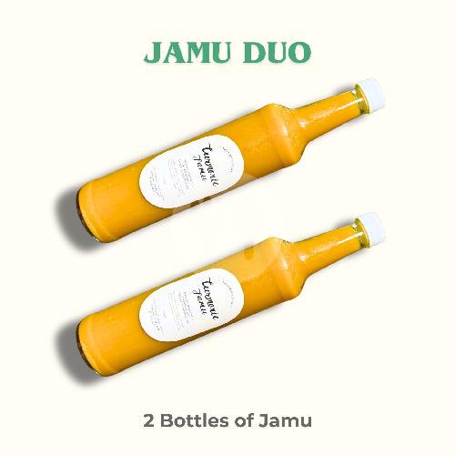 Two bottles of our house-made jamu, crafted with turmeric, ginger, cinnamon, black pepper, tamarind, palm nectar. Cold, refreshing and good for your gut, immunity and glow.