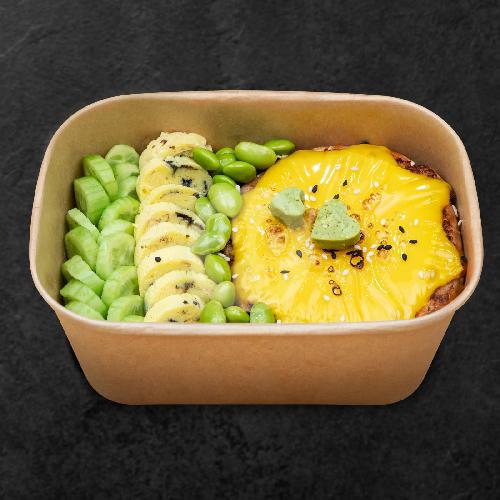 Sushi rice, baby cucumber, truffle tamago, truffle edamame, salmon patty, cheedar cheese, sesame dressing, poke sauce, furikake, wasabi, sesame seed.