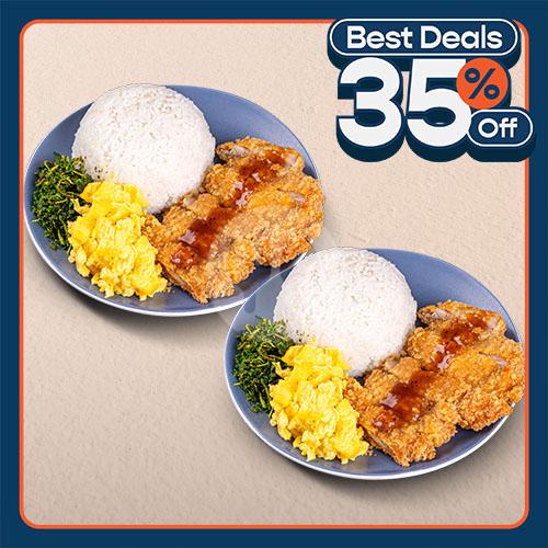 Katsunya ada 2 bisa buat makan romantis bareng kanojo/kareshi, (2 Pilihan Rice + 2 Katsu Ayam Sauce Hickory Smoke + 2 Scrambled Egg + 2 Crispy Bayam/Kremes)