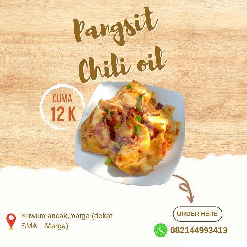 Pangsit Chili Oil Dengan Pangsit Yang Lembut Dengan Isian Daging Ayam Yang Melimpah,Dibuat Dengan Campuran Bumbu Sambal Cabai Segar,Chili Oil ,Minyak Bawang, Dan Bumbu Lainnya. (TIDAK MENGGUNAKAN MICIN)