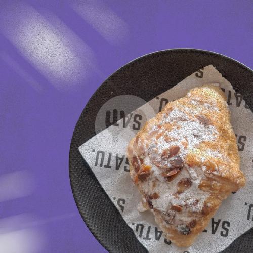 Croissant renyah dengan almond panggang dan taburan gula halus.
