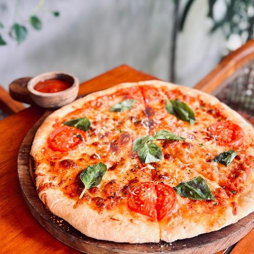 Neapolitan pizza with tomato concasse, mozzarella cheese and basil leaf