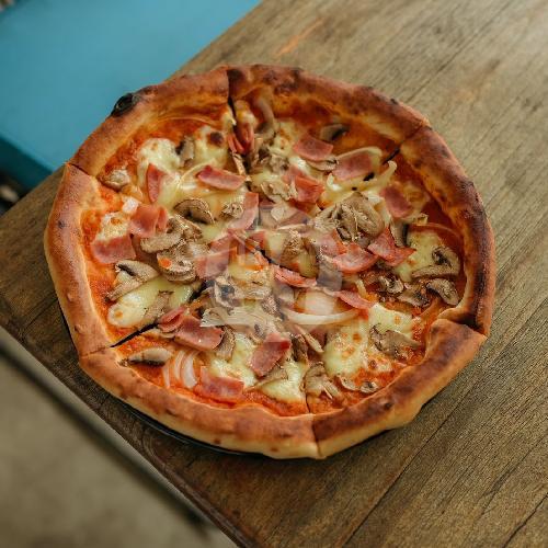 Tomato sauce, mozzarella, onion, mushroom, and ham