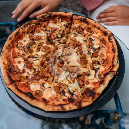 Tomato sauce, mozzarella, mushroom, onion, chicken teriyaki
