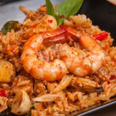 Nasi goreng merah dengan seafood +bakso udang + kerupuk