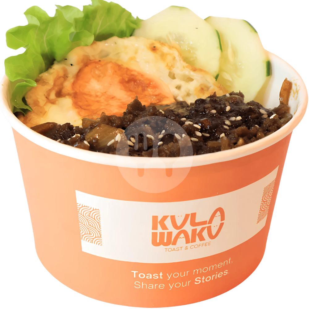 Rice bowl dengan hidangan nasi yang disajikan dalam bowl dengan topping sayur, telur, dan Beef Bulgogi di atasnya