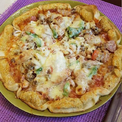 BEST SELLER ! dengan toping beef, chiken, sosis, serta dilengkapi pinggiran sosis di setiap potongan pizza ( 8 slice)