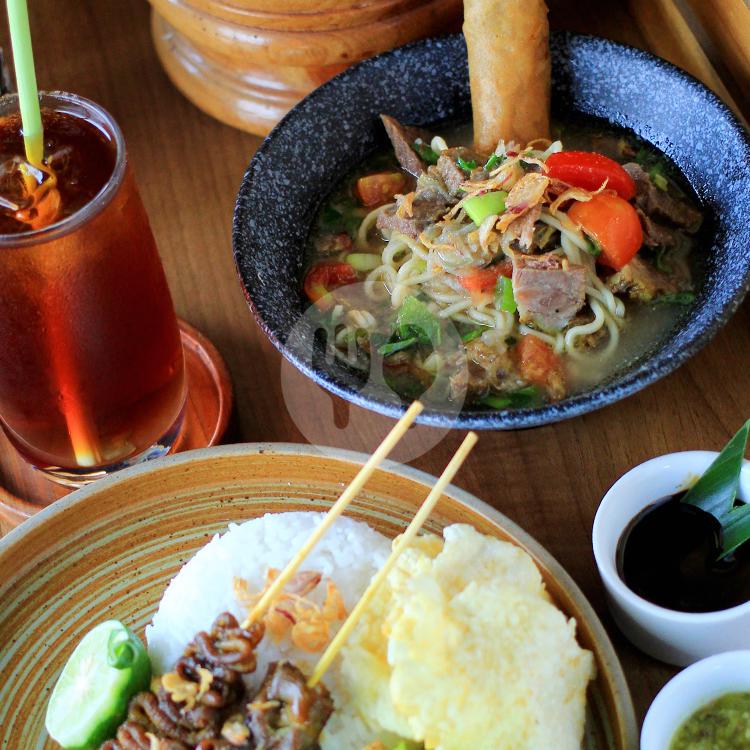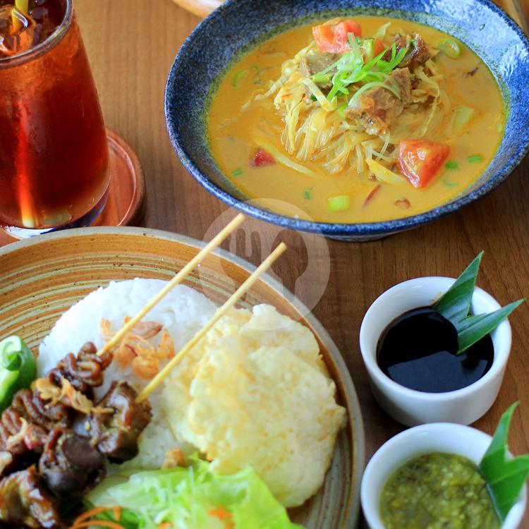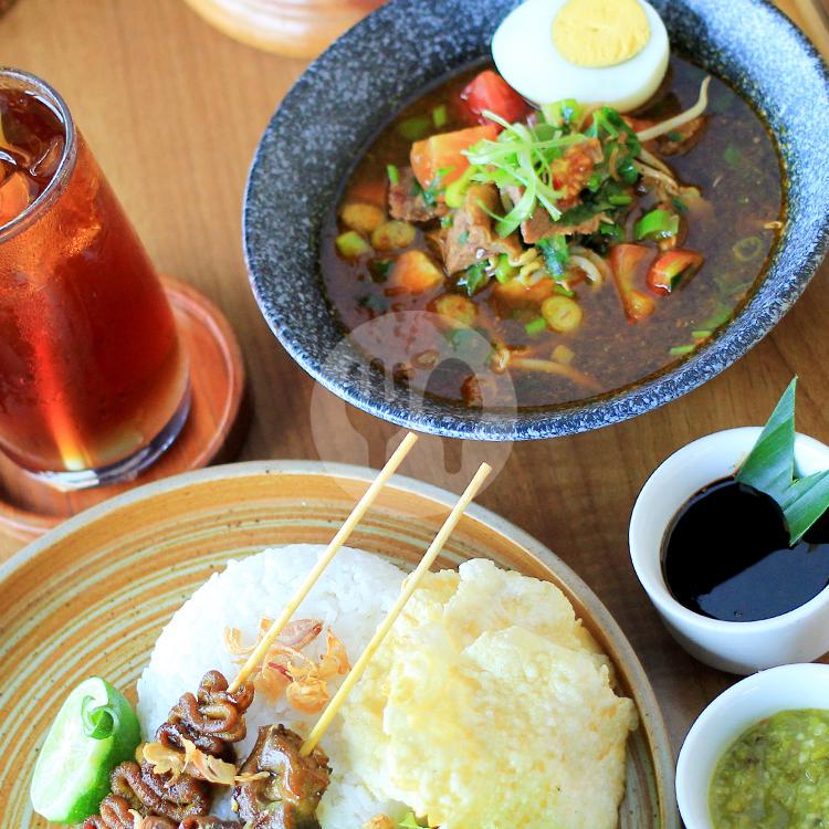 Soto rawon dihidangkan dengan nasi dan sate, include es teh serai
