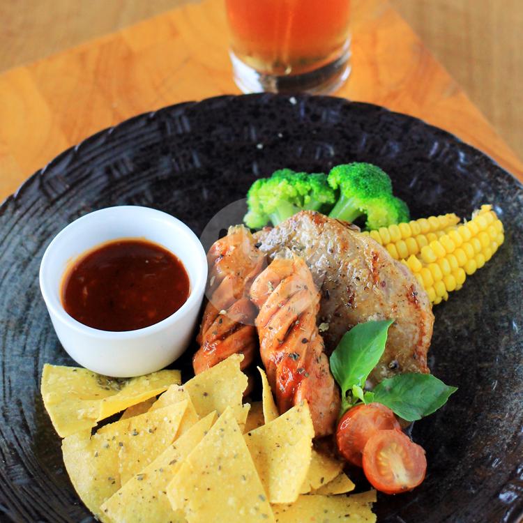 Daging meltique dan sosis disajikan dengan saus barbeque, include es teh