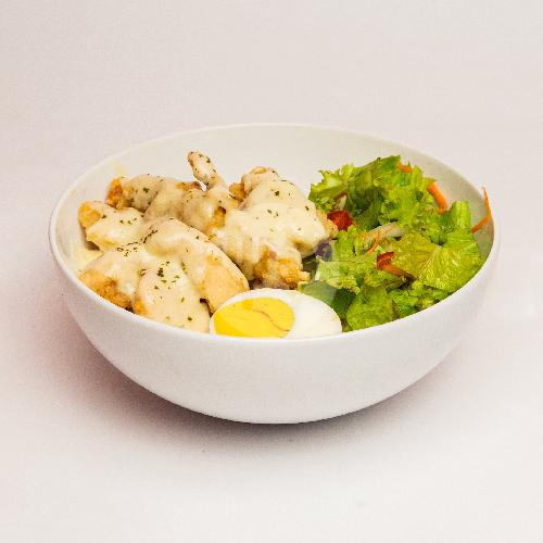 Rice, chicken crispy with sauce butter milk, egg, and salad