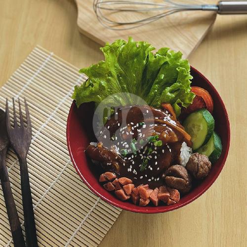 Nasi, Beef Nugget Saus BBQ, Bakso, Sosis, Timun, Tomat