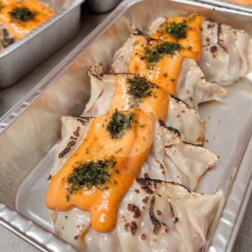 5 pcs gyoza. dipanggang sempurna diatas pan, lembut nya gyoza dipadukan dengan saus mentai yang meleleh di mulut