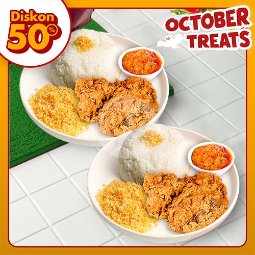 2x lipat kenyang, dua kali lipat bahagia! Dapetin 2 paket komplit isi nasi hangat, fried chicken juicy, sambal Pedas Original yang nendang, plus kremes renyah. Pas buat makan bareng atau stok perut happy seharian!