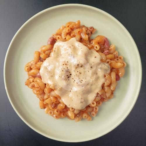Macaroni + Red Bean Chili (Kacang Merah Daging Sapi Cincang Yang Dimasak Dengan Saos Mexico) With Bechamel Sauce On Top