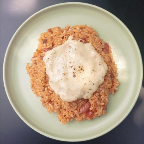 Nasi Goreng Dengan Red Bean Chili (kacang merah daging sapi cincang yang dimasak dengan saos khas Mexico) with Bechamel Sauce on top