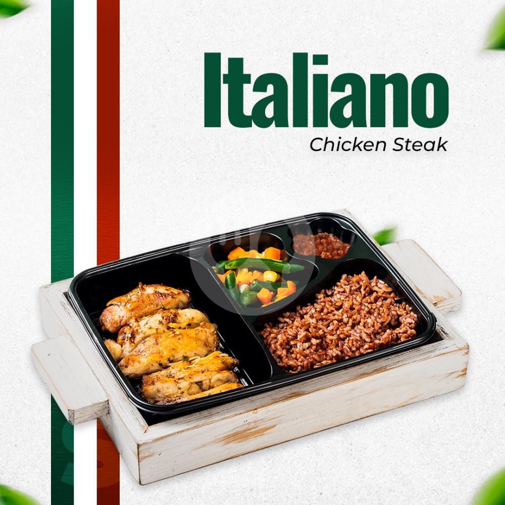 Chicken steak, Sayuran, Nasi merah, dan sauce Italian khas Dietgo