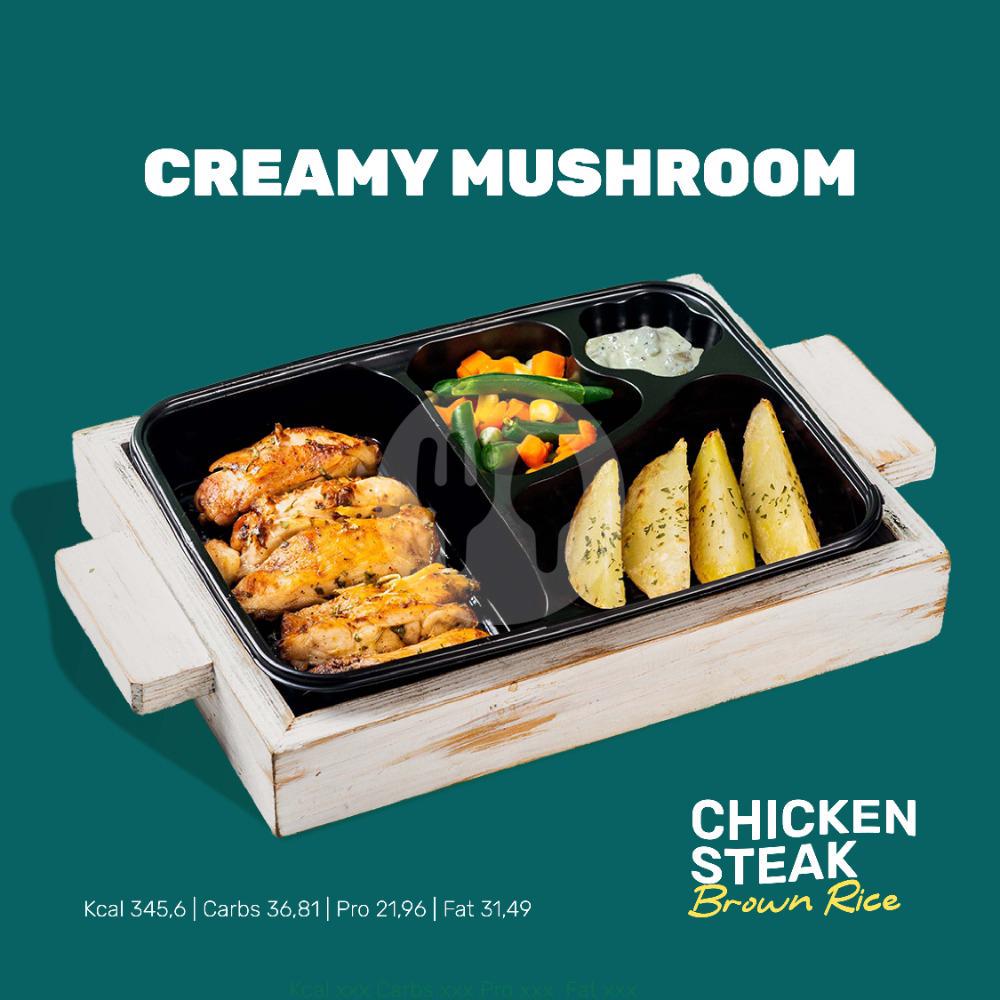 Chicken steak, Kentang, Sayuran, dan saus Creamy Mushroom khas Dietgo