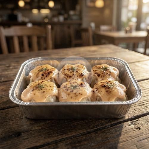 Definisi comfort food. Dimsum ayam padat berdaging diselimuti saus mentai homemade yang tebal dan creamy, lalu dibakar (torch) dadakan sampai wangi. Simpel, klasik, dan ngangenin.