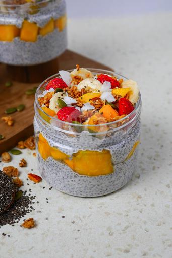 374 KCal. Chia Seed Pudding yang dipadukan dengan Granola, Pumpkin Seeds, Dried Coconut, Pisang, Strawberry dan Mangga! (Mengandung Susu dan Yoghurt)