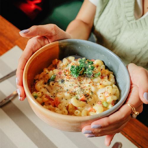 Macaroni Pasta, Smoked Beef, Mixed Vegetables Disajikan Dengan Saus Keju Ala Fuego