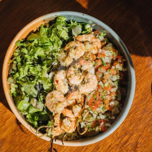 Shrimp Skewers Served On Top Of Butter Rice And Salad, With Salsa Sauce