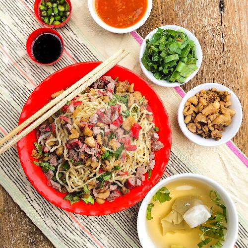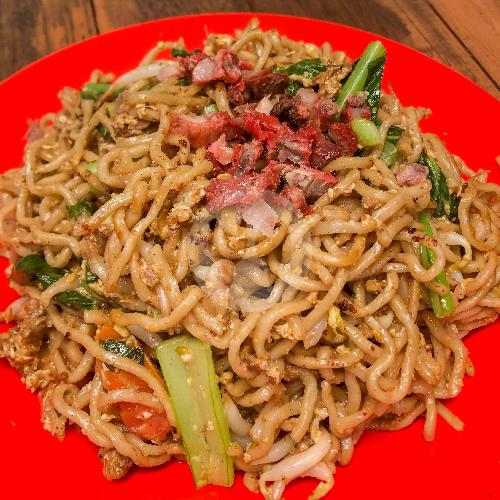 Mie dengan buatan lapo sendiri, memakai daging babi tumis dan topping babi merah dan yupo (kerupuk kulit babi)