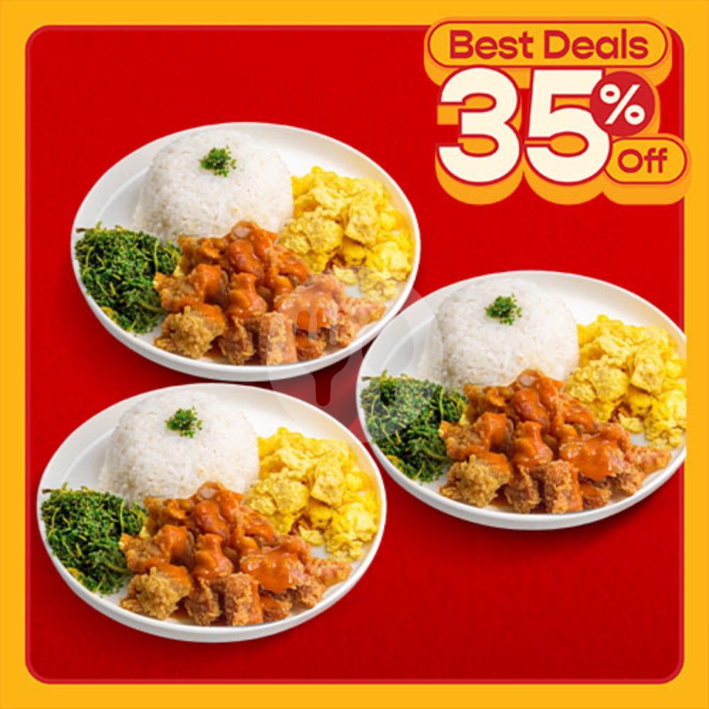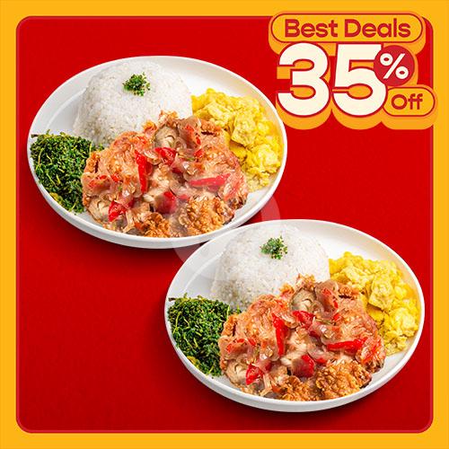 Makin banyak, makin puas, gurih rempahnya bikin nagih! (Pilihan Nasi + Ayam Popcorn Saus Kari + Telur + Crispy Bayam/Kremes)