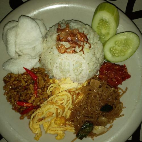 Nasi + Telur Dadar + Bihun Goreng/Mie Goreng + Orek Tempe + Sambal + Timun + Kerupuk