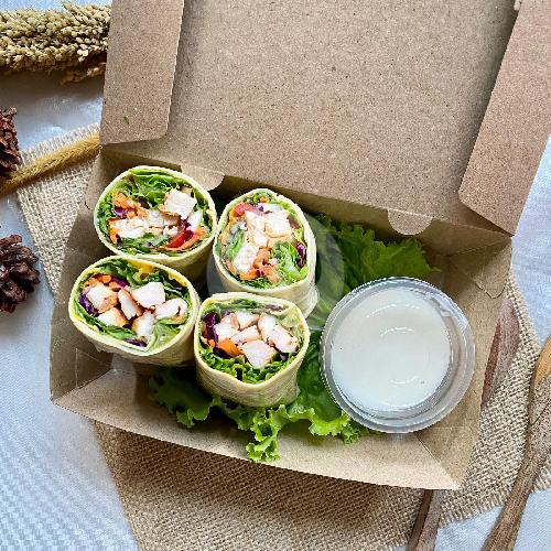 Seladah, kyuri,wortel,tomat cherry,kol ungu, tortila dan pilihan protein juga pilihan dressing. 2 roll menjadi 4 potong