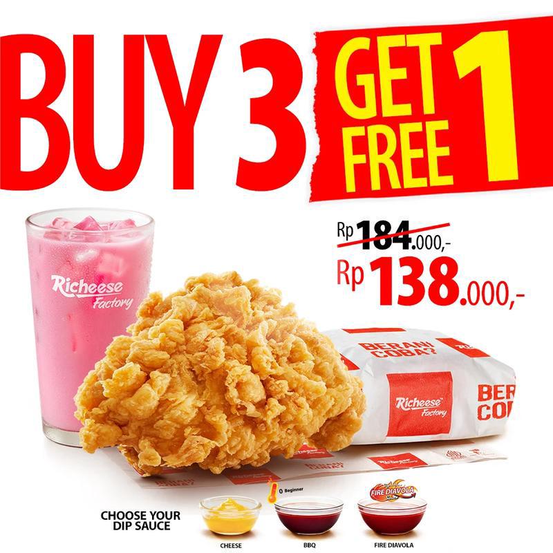 3 Flying Chicken (Spicy/Non Spicy) + 12 Rice + 12 Small Drink + Cheese Sauce.