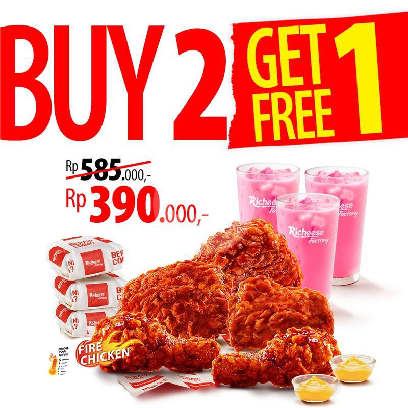 15 Pcs Fire Chicken + 9 Rice + 9 Small Drink + Cheese Sauce.