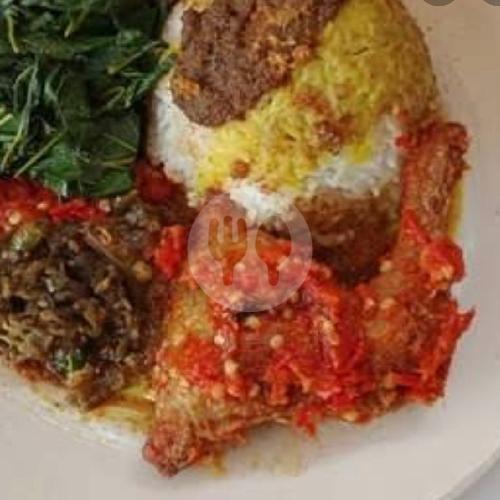 Nasi Ayam Goreng Dengan Baluran Balado Khas Padang Lengkap Dengan Kuah, Sambal, Nangka dan Daun Singkong