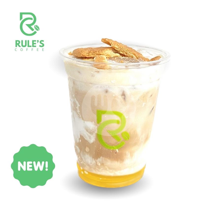 Kopi susu dengan sirup morocan dan toping regal biscuit