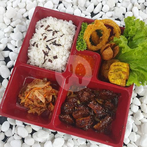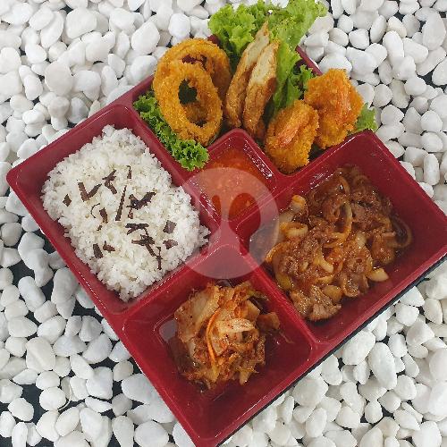 Nasi, Beef Slice Bbq, Ebi Furai, Fish Roll, Onion Ring, Kimchi