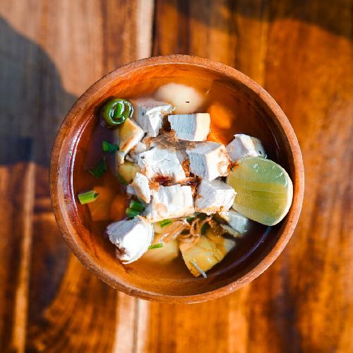 Sop wortel, kentang, irisan ayam, sambal, daun bawang seledri.