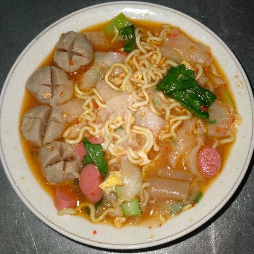 Ceker 2 pcs, pentol ayam 2 pcs (iris tipis), sosis, makaroni, kerupuk, mie, telur orak arik.