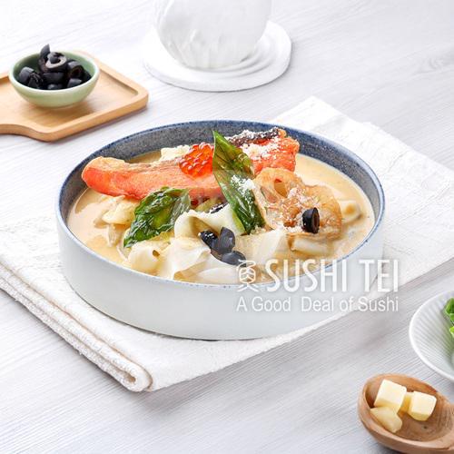 Creamy carbonara sauce meets chewy udon noodles, served with perfectly fried salmon, mushroom, cheese, and black olive & salmon roe