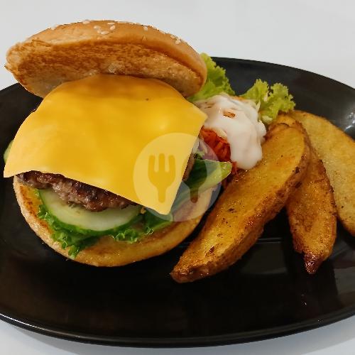 Roti Bun Yang Di Badukan Dengan Petti Yang Berasal Dari Daging Sapi Cincang, Di Tambahkaan Dengan Kentang