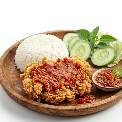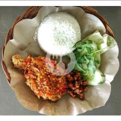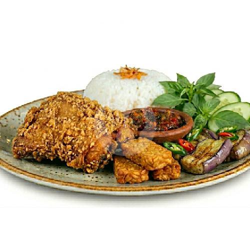 Ayam Goreng + nasi putih, lalapan segar, sambal pedas ditambah Terong, Tahu, Tempe