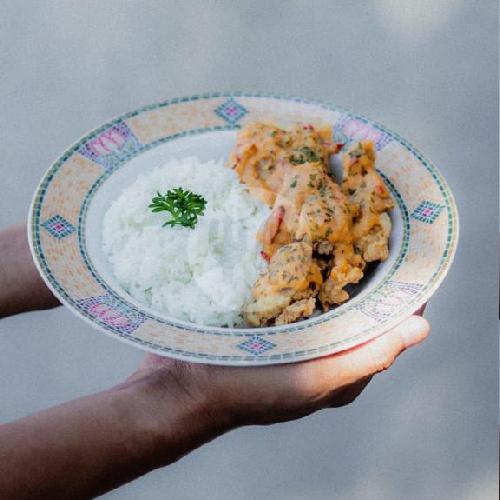 Nasi Putih Dengan Ayam Yang Disiram Saus Telur Asin